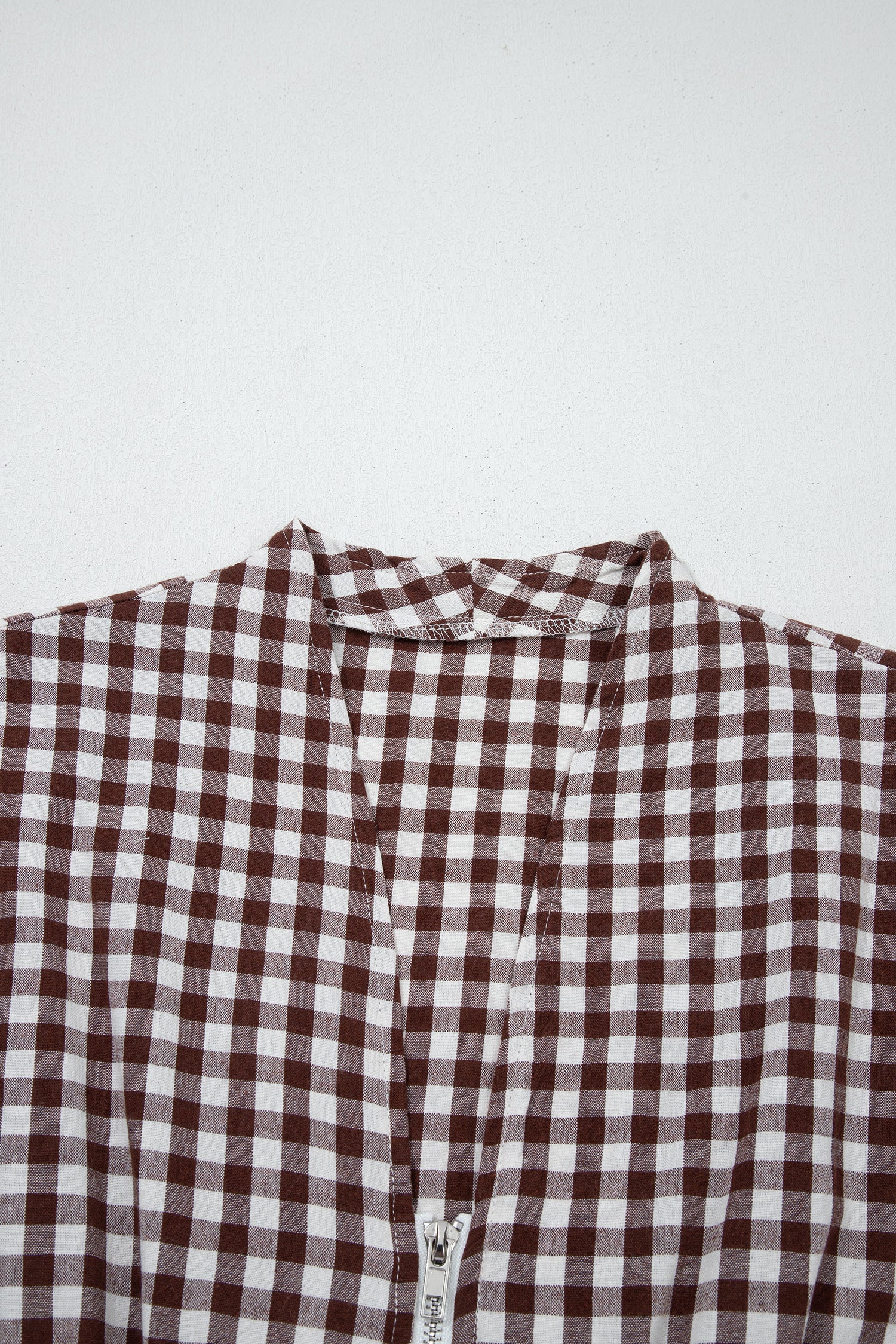 Coffee Plaid Print Full Zipper Cinched Waist Fit Flare Sleeveless Maxi Dress