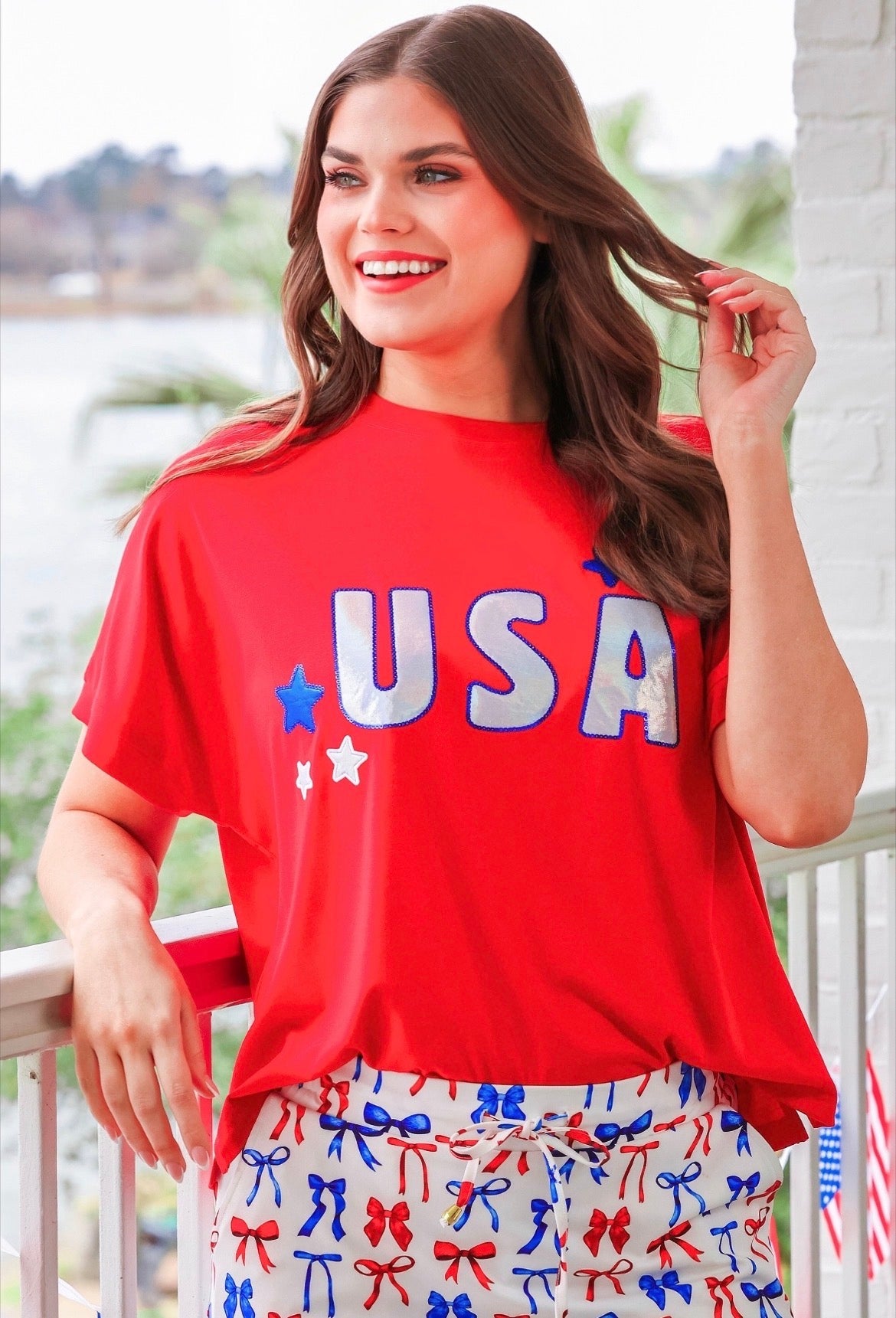 Rock your red, white, and blue with this dazzling USA Foil Luxe Top! Decked out in eye-catching metallic foil patches and vibrant Americana stars, this luxe creation brings the perfect dose of patriotic pizzazz. Ideal for Fourth of July celebrations or whenever you're feeling your patriotic best, this playful piece combines comfort with serious sparkle. Grab yours and let your stars shine!