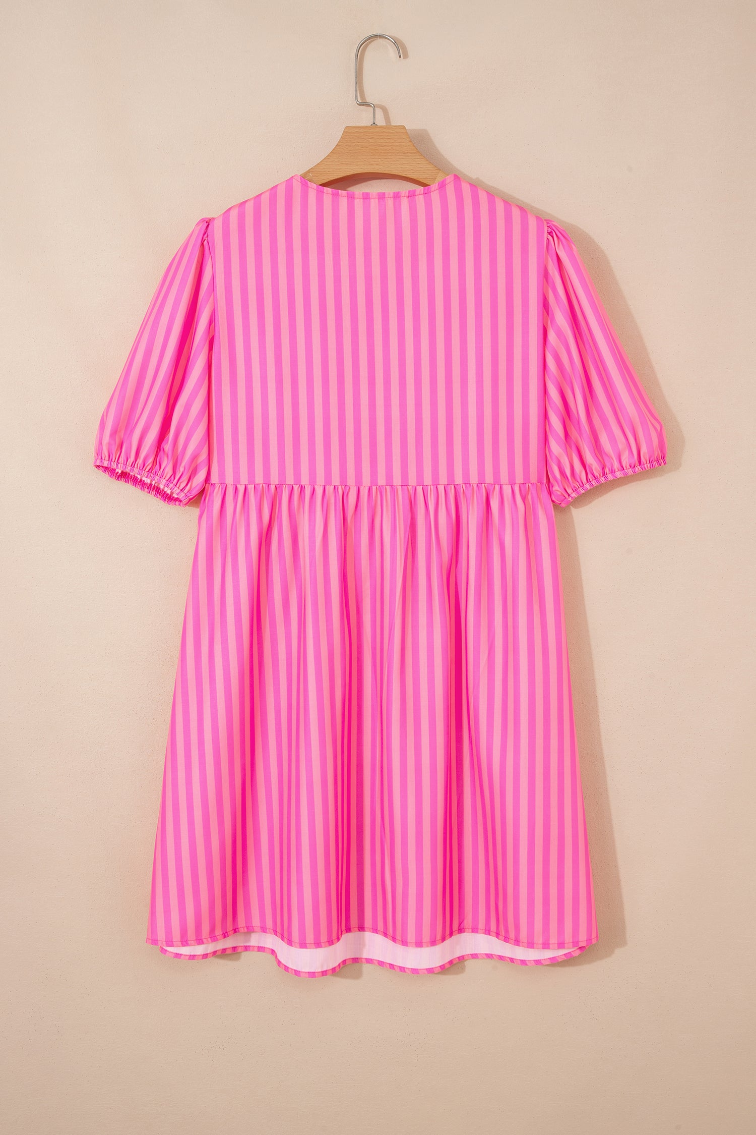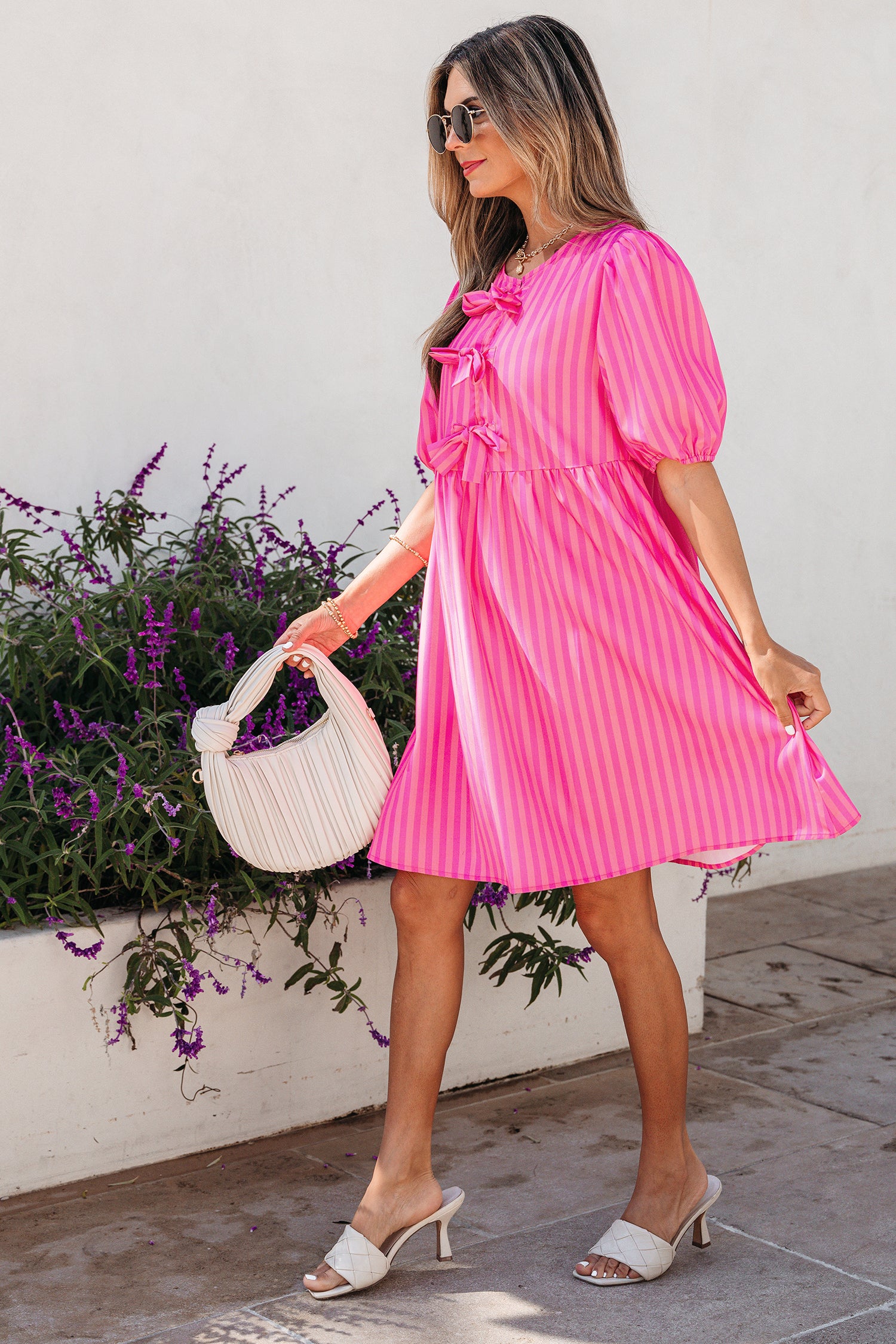 Rose Striped Print Bow Detail Short Puff Sleeve Mini Dress